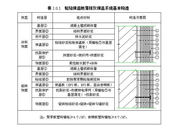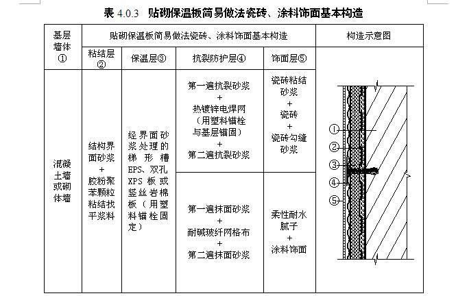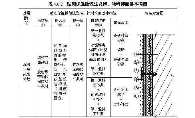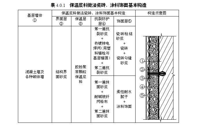 4.0.1  保温浆料做法的胶粉聚苯颗粒保温浆料(简称保温浆料)保温层采用现场抹灰成型做法使之形成一个有机的整体并无板缝,大量纤维的添入使保温层不易发生空鼓;墙体基层用结构界面砂浆处理,使吸水率不同的材料附着力均匀一致;饰面层采用瓷砖的抗裂防护层采用抗裂砂浆复合热镀锌电焊网做法,热镀锌电焊网由塑料锚栓锚固于基层墙体,抗震性能好;瓷砖采用专用瓷砖粘结砂浆及瓷砖勾缝砂浆,粘结力强、柔韧性好、抗裂防水效果好。该做法各构造层材料柔韧性匹配,热应力释放充分。饰面层采用涂料的抹面砂浆抹面后压入耐碱玻纤网格布,表面抹抹面砂浆成活。其基本构造见表4.0.1。