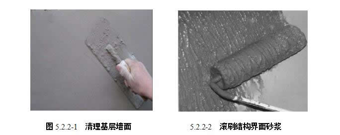 清理干净墙面,不应有油渍、浮灰等。墙面松动、风化部分应剔除干净。墙表面凸起物大于10mm时应剔除(图5.2.2-1)。为使基层界面附着力均匀一致,墙面均应做到界面处理无遗漏。结构界面砂浆可用喷枪或滚刷施工(图5.2.2-2)。砖墙、加气混凝土墙在界面处理前要先淋水阴透墙面,阴干后方可施工。堵脚手眼和废弃的孔洞时,应将洞内杂物、灰尘等物清理干净,浇水湿润,然后按要求将其补齐砌严。