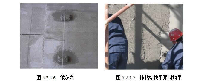 1) 做灰饼、冲筋在距大墙阴角或阳角约100mm处,根据垂直控制通线按1.5m左右间距做垂直方向灰饼,顶部灰饼距楼层顶部约100mm,底部灰饼距楼层底部约100mm。待垂直方向灰饼固定后,在同一水平位置的两个灰饼间拉水平控制通线,具体做法为将带小线的小圆钉插入灰饼,拉直小线,小线要比灰饼略高1mm,在两灰饼之间按1.5m左右间距水平粘贴若干灰饼或冲筋(图5.2.4-)。灰饼可用保温浆料做,也可用废保温板裁成50mm×50mm小块粘贴。每层灰饼粘贴施工作业完成后水平方向用5m小线拉线检查灰饼的一致性,垂直方向用2m托线板检查垂直度,并测量灰饼厚度,冲筋厚度应与灰饼厚度一致。用5m小线拉线检查冲筋厚度的一致性,并作记录。