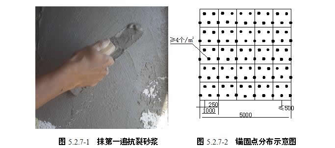 待保温层或找平层施工完成3~7d且施工质量验收合格后,即可进行抗裂防护层施工。先抹第一遍抗裂砂浆,厚度控制在2~3mm(图5.2.7-1)。接着铺贴热镀锌电焊网,应分段进行铺贴,热镀锌电焊网的长度最长不应超过3m。为使施工质量得到保证,施工前应预先展平热镀锌电焊网并按尺寸要求裁剪好,边角处的热镀锌电焊网应折成直角。铺贴时应沿水平方向按先下后上的顺序依次平整铺贴,铺贴时先用U型卡子卡住热镀锌电焊网,使其紧贴抗裂砂浆表面,然后按双向@500mm梅花状分布(图5.2.7-2)用塑料锚栓将热镀锌电焊网锚固在基层墙体上,有效锚固深度不得小于25mm,局部不平整处用U型卡子压平。热镀锌电焊网之间搭接宽度不应小于两个网格,搭接层数不得大于3层,搭接处用U型卡子和钢丝固定。所有阳角处的热镀锌电焊网不应断开,阴阳角处角网应压住对接片网。窗口侧面、女儿墙、沉降缝等热镀锌电焊网收头处应用水泥钉加垫片将热镀锌电焊网固定在主体结构上。