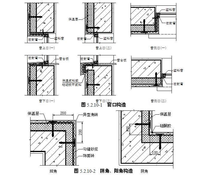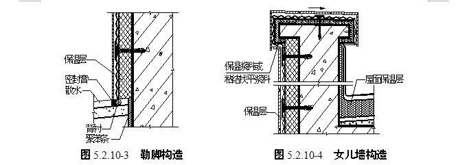 细部节点做法参现图5.2.10-1~图5.2.10-4(图中保温浆料做法的保温层是保温浆料,贴砌保温板做法的保温层是粘结找平浆料+保温板+粘结找平浆料,贴砌保温板简易做法的保温层是粘结找平浆料+保温板)。