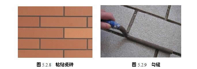 贴砖施工前,应在粘贴基层上充分用水湿润。贴砖作业一般从上至下进行,高层建筑大墙面贴砖应分段进行,每段贴砖施工应由下至上进行。先固定好靠尺板贴最下一皮砖,瓷砖贴上后用灰铲柄轻轻敲击砖面使之附线,轻敲表面固定(图5.2.8)。用开刀调整竖缝,用小杠尺通过标准点调整平整度和垂直度,用靠尺随时找平找方。在粘结层初凝时,可调整瓷砖的位置和接缝宽度,初凝后严禁振动或移动瓷砖。砖缝宽度可用自制米厘条控制,如符合模数也可采用标准成品缝卡。墙面突出的卡件、水管或线盒处宜采用整砖套割后套贴,套割缝口要小,圆孔宜采用专用开孔器来处理,不得采用非整砖拼凑镶贴。粘贴施工时,当室外气温大于35℃,应采取遮阳措施。贴砖时背面打灰要饱满,粘结灰浆中间略高四边略低,粘贴时要轻轻揉压,压出灰浆最后用铁铲剔除灰浆。粘结灰浆厚度宜控制在3~5mm左右。瓷砖的垂直、平整度应与控制瓷砖一致。