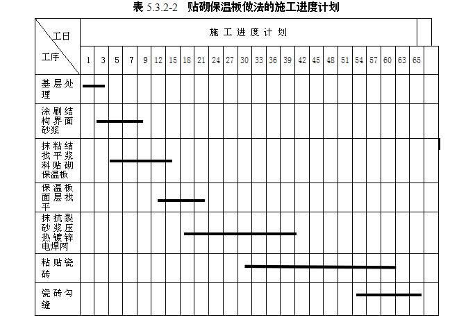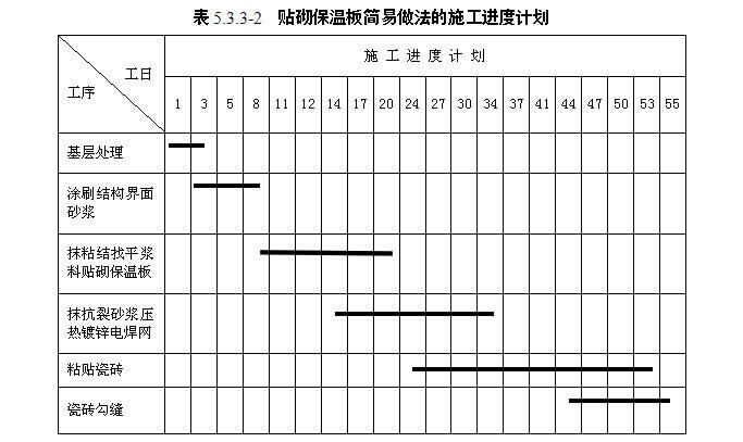 5.3.3  贴砌保温板简易做法(按外墙保温面积10000m2、工期60天计算)的劳动力计划见表5.3.3-1,施工进度计划见表5.3.3-2,每平方米的劳动(标准)定额见表5.3.3-3。