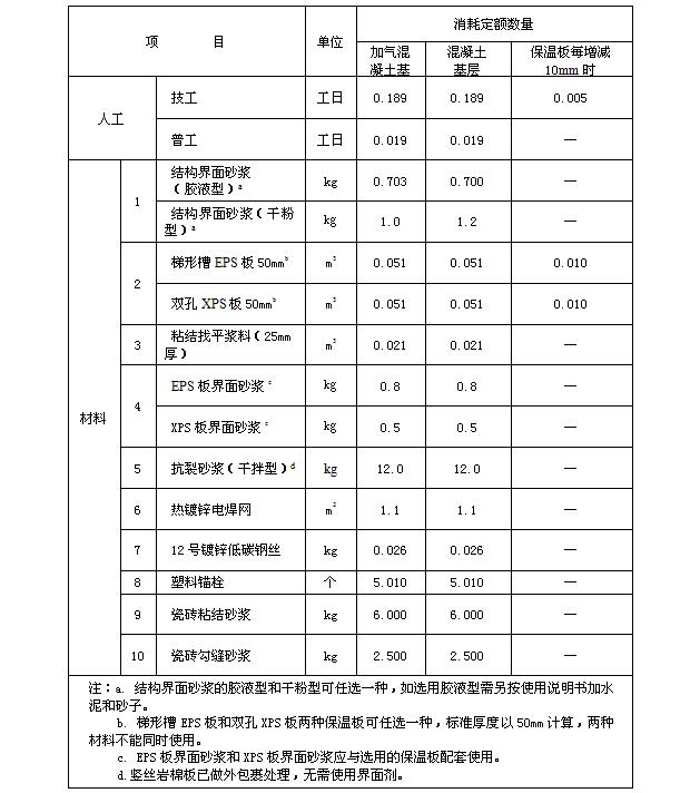 4.0.3  贴砌保温板简易做法采用粘结找平浆料满粘、贴砌双面涂刷保温板界面砂浆的梯形槽EPS板、双孔XPS板或竖丝岩棉板,板间留10mm板缝,贴砌后用粘结找平浆料填平板缝及XPS板的两个孔洞,若采用竖丝岩棉板需用塑料锚栓固定(6个/㎡),以增强保温板与粘结层、抗裂防护层的连接性能,提高系统的透气性。其基本构造见表4.0.3。