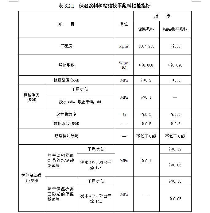 6.2.1  保温浆料和粘结找平浆料的性能指标应符合表6.2.1的要求。