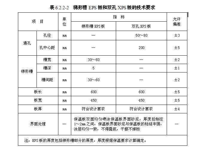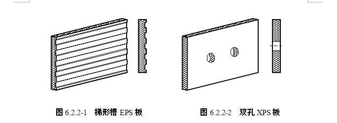 2、为了便于粘贴,EPS板粘贴面开有与长度方向平行的梯形槽(图6.2.2-1),简称梯形槽EPS板;为了便于透气和粘贴,在XPS板长度方向的中轴线上开有两个垂直于板面的通孔(图6.2.2-2),简称双孔XPS板。梯形槽EPS板和双孔XPS板的技术要求见表6.2.2-2。
