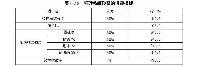 6.2.8  瓷砖粘结砂浆的性能指标应符合表6.2.8的要求。