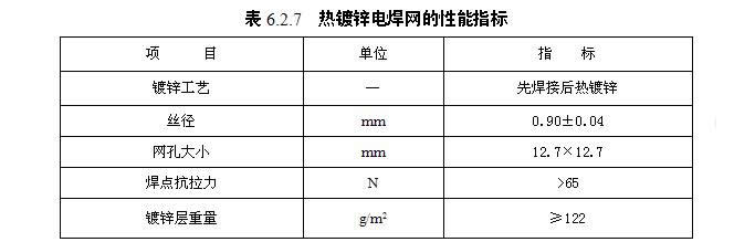 6.2.7  热镀锌电焊网的性能指标除应符合《镀锌电焊网》(QB/T 3897—1999)的要求外,还应符合表6.2.7的要求。