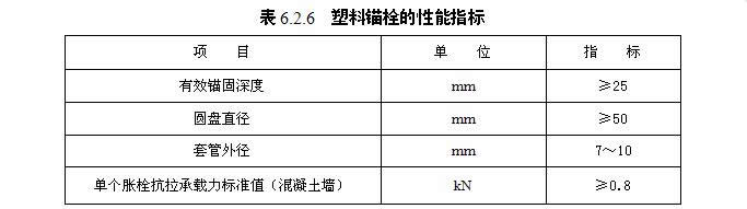 6.2.6  塑料锚栓由螺钉和带圆盘的塑料膨胀套管两部分组成,其中螺钉采用经过表面防锈蚀处理的金属制成,塑料膨胀套管应采用聚酰胺、聚乙烯或聚丙烯等制作,不得使用回收的再生材料。塑料锚栓的性能指标应符合表6.2.6的要求。