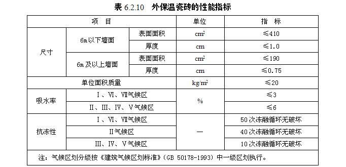6.2.10  瓷砖粘贴面应带有燕尾槽,并不得有脱模剂,其性能指标除应符合《陶瓷砖》(GB/T 4100)、《陶瓷劈离砖》(JC/T 457)、《玻璃马赛克》(GB/T 7697)的相关要求外,还应符合表6.2.10的要求。