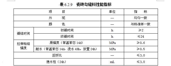 6.2.9  瓷砖勾缝料的性能指标应符合表6.2.9的要求。