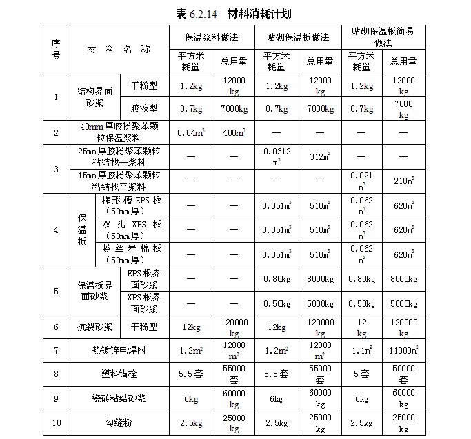 6.2.14  材料消耗计划(按外墙保温面积10000m2计算)见表6.2.14。