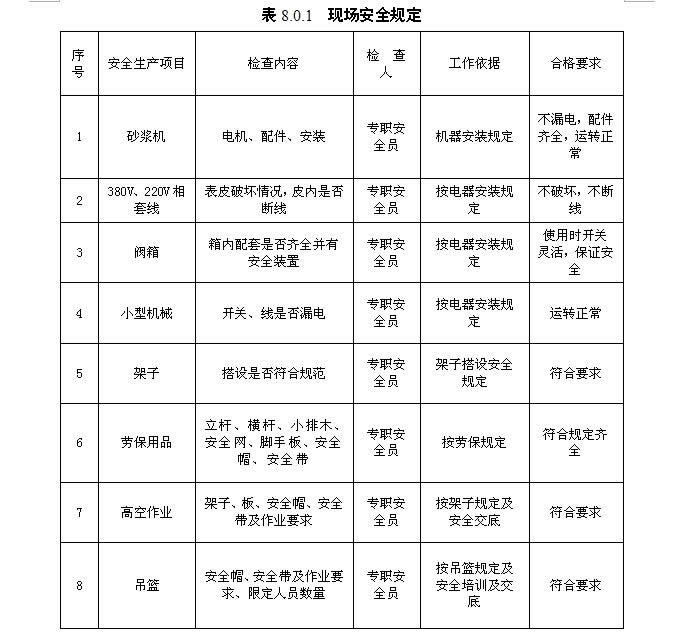 8.0.1  每个工地须委派专职安全员,负责施工现场的安全管理工作,制定并落实岗位安全责任制,签订安全协议。工人上岗前必须进行安全技术培训,合格后才能上岗操作。制定意外安全事故应急处理预案,以防意外发生。现场安全规定应符合表8.0.1的要求。