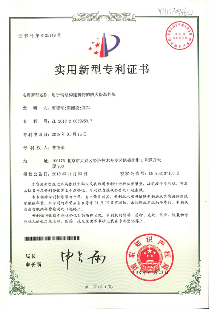 实用新型专利 证书号第8125149号