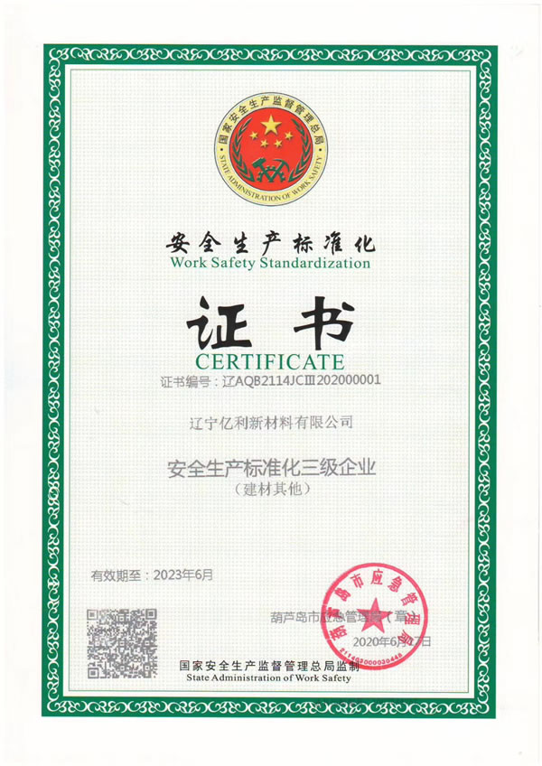 辽宁亿利新材料有限公司一直坚持安全标准化生产,在领导高度重视下,各个部门通过辛勤付出和努力,认真落实一系列安全生产标准化相关工作,2020年6月17日辽宁亿利新材料有限公司顺利通过安全标准化评审,获得了安全生产标准化三级企业荣誉证书。