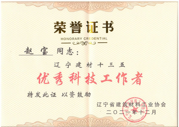 赵宝同志被评为“辽宁建材十三五优秀科技工作者”