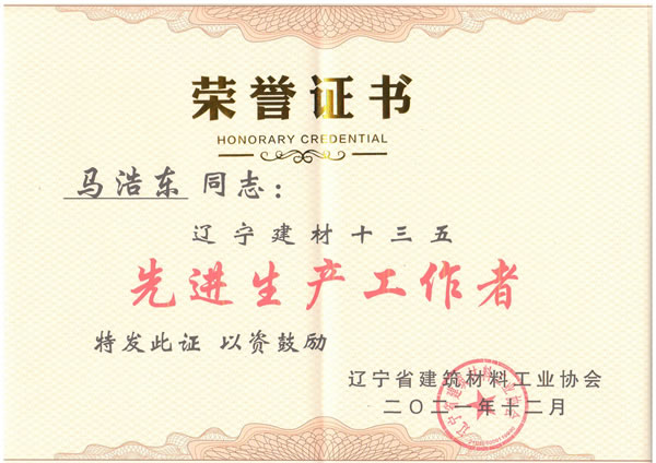 马浩东同志被评为“辽宁建材十三五先进生产工作者”