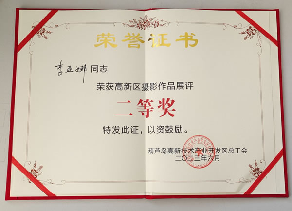 近日,葫芦岛高新区总工会组织举办“匠心筑梦、劳动最美”书画、摄影及征文作品评选活动,我公司工会动员广大职工积极参与,经过评选,公司职工李亚娜荣获摄影二等奖。
