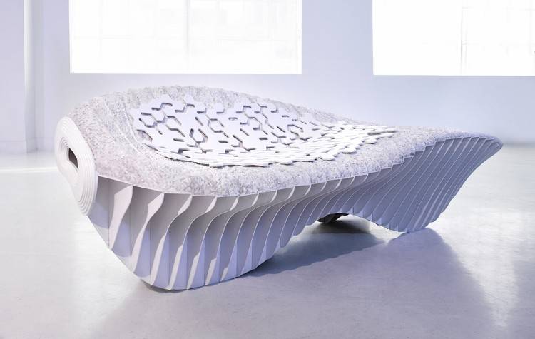 Terreform ONE公司研发的可降解家具:如果你的椅子由混合肥料组成,将会怎样?这是由一系列生物制造长椅的试验提出的。Terreform ONE和Genspace公司通过类似的工艺共同研发了两张生物塑料椅:一个是马车躺椅,由一系列白骨以参数化外形构成的,椅子上加了柔软的垫子;另一个是儿童椅,由片段联动组成,可调节成不同的形状。