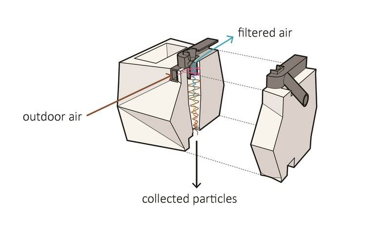 可吸收污染的砖:可呼吸的砖被设计为建筑正常通风系统的一部分,它是一种双层结构,外部是精制的砖,内层是标准绝缘的结构。呼吸砖的设计概念是旋风过滤,一个来自现代真空吸尘器的理念,将空气中重的污染颗粒分离出来,然后掉落到在墙的底部可移除的漏斗中。