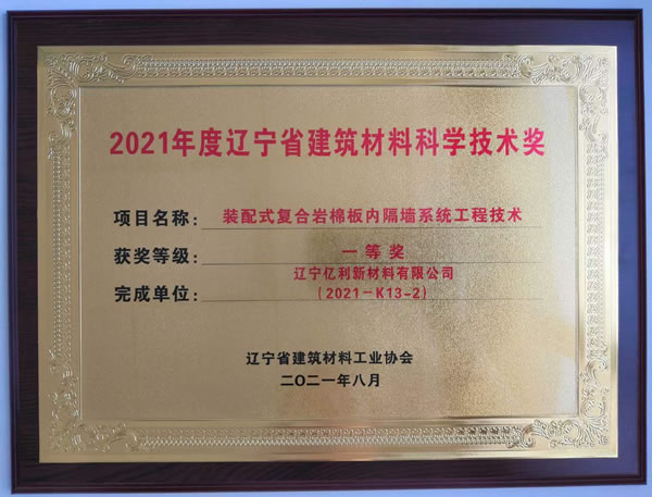 为深入实施创新驱动发展战略,助推建材行业向高质量发展,经专家评审、网上公示,我公司申报的《装配式复合岩棉板内隔墙系统工程技术》项目被评为2021年度辽宁省建筑材料科学技术奖一等奖。 这一奖项的获得,既是对我公司研发团队创新实力的认可,更是对我公司在新型建材行业中科研能力和技术水平的肯定。今后,公司将继续以科技创新为首要推动力量,以创建节能环保型企业为目标,加强管理,加大投入,加快发展,为保温行业发展做出新的更大的贡献!